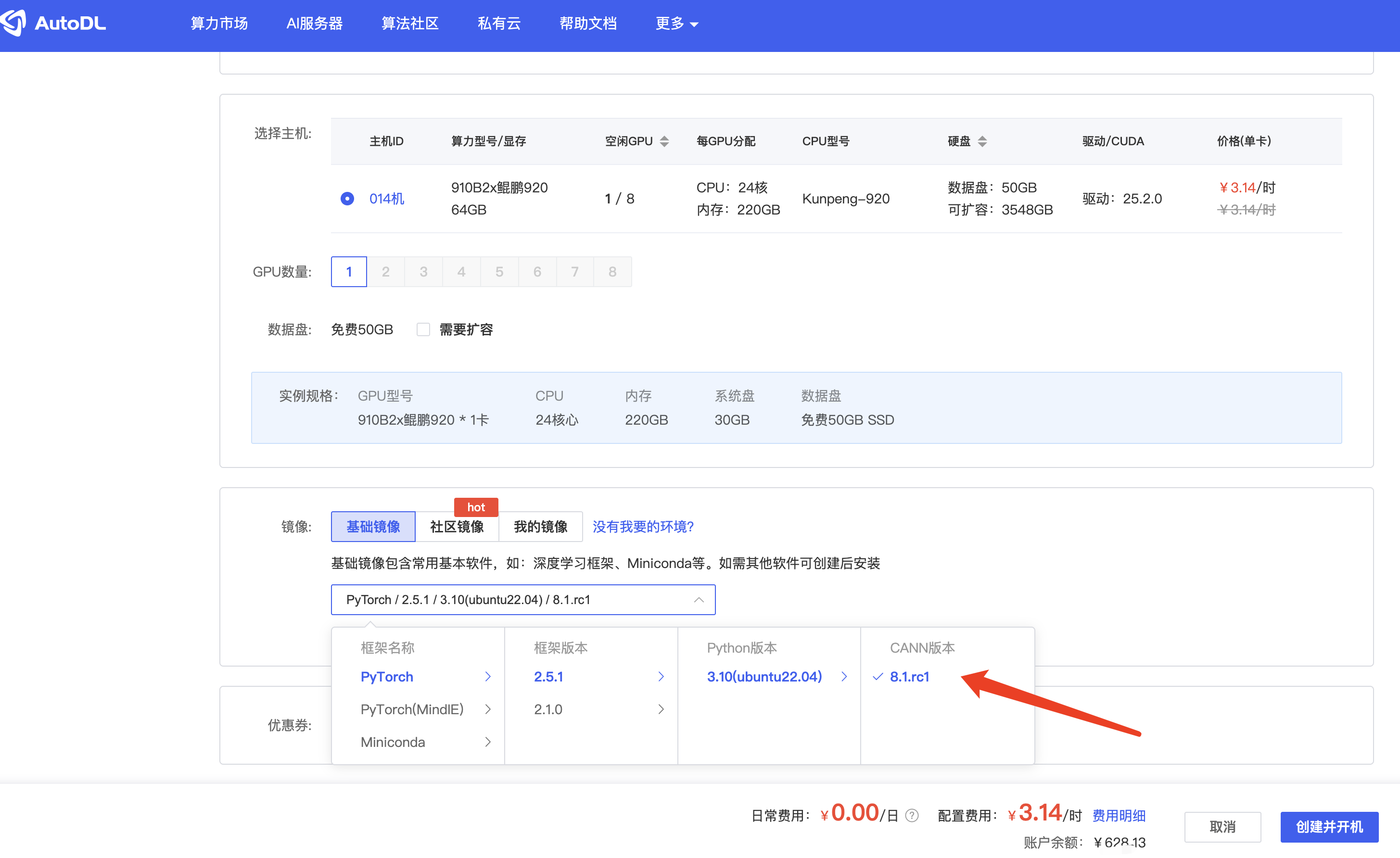本次教程使用昇腾910B2,也就是NPU来进行训练,在AutoDL上创建NPU的容器进行训练,过程很简单,我们在下面的教程里会一步一步指导。