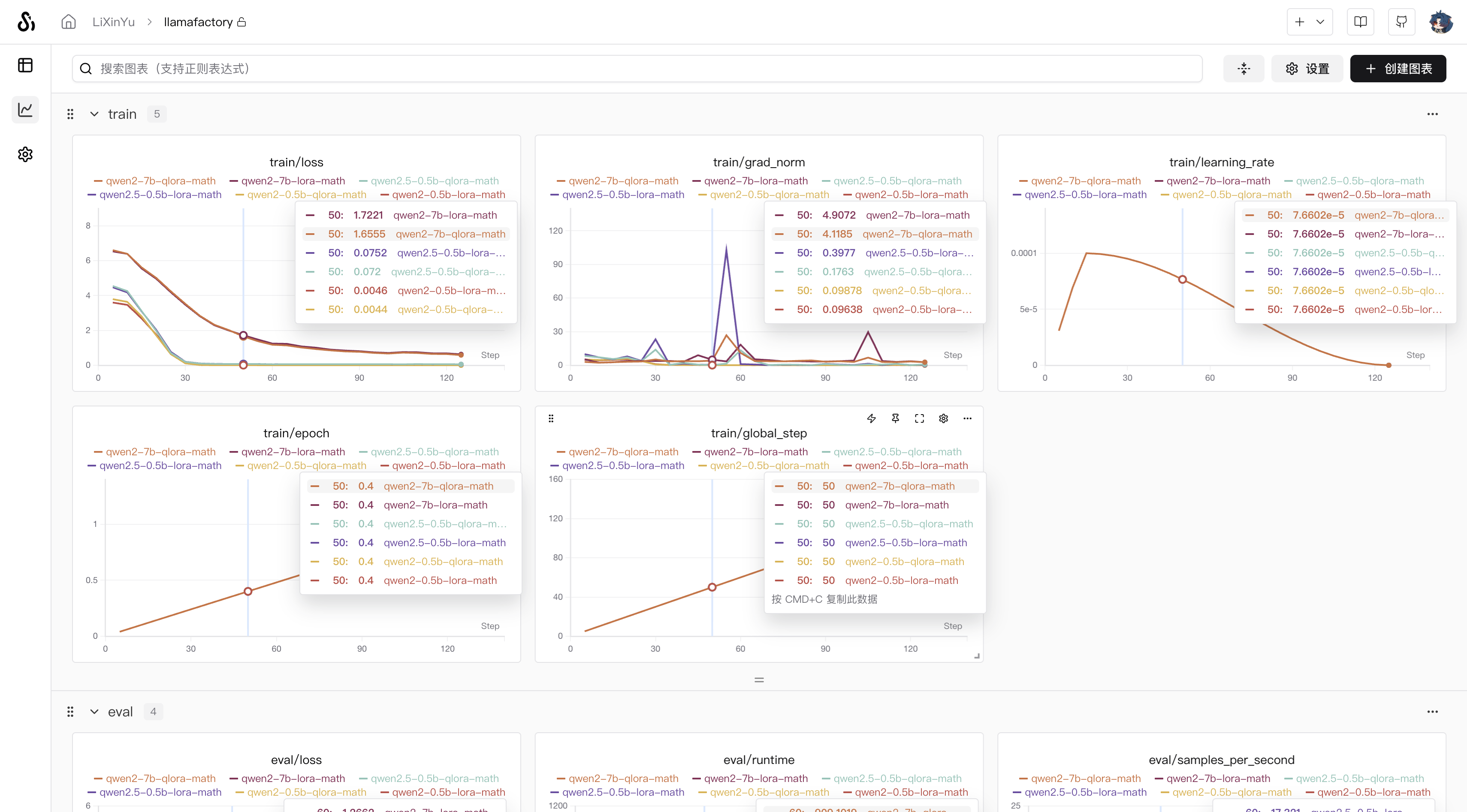 而从训练曲线上看,qlora和lora效果差不多,如果对结果有验证需求的炼丹师可以参考我的另一篇文章,使用evalscope框架来eval的,地址在这👉地址,llamafactory好像把原来的eval功能删了,那这里就不再赘述了。