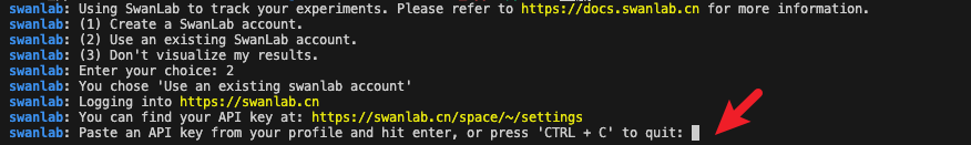 如果你是第一次使用SwanLab,那么还需要去https://swanlab.cn上注册一个账号,在***用户设置(右上角)***页面复制你的API Key,然后在训练开始时,选择【2】,然后粘贴进去即可:
