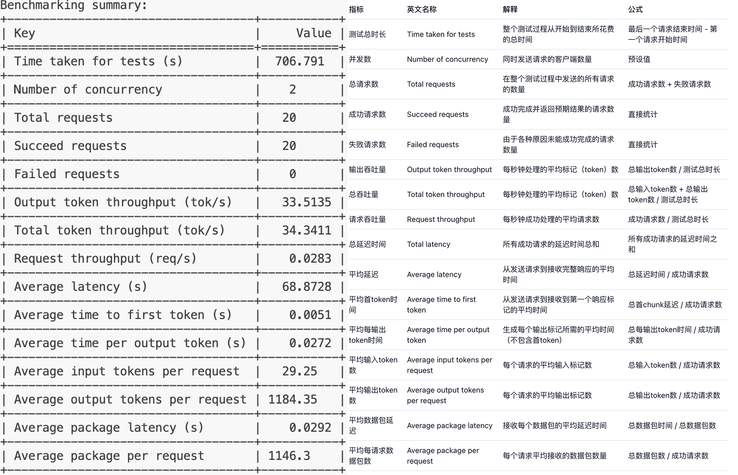 综合来看,这个模型在处理单个请求时的延迟较高,请求吞吐量较低,这可能意味着在当前配置下,模型的性能表现不佳,特别是在需要快速响应的场景中。可能需要对模型进行优化,或者在部署时考虑增加资源以提高性能。
