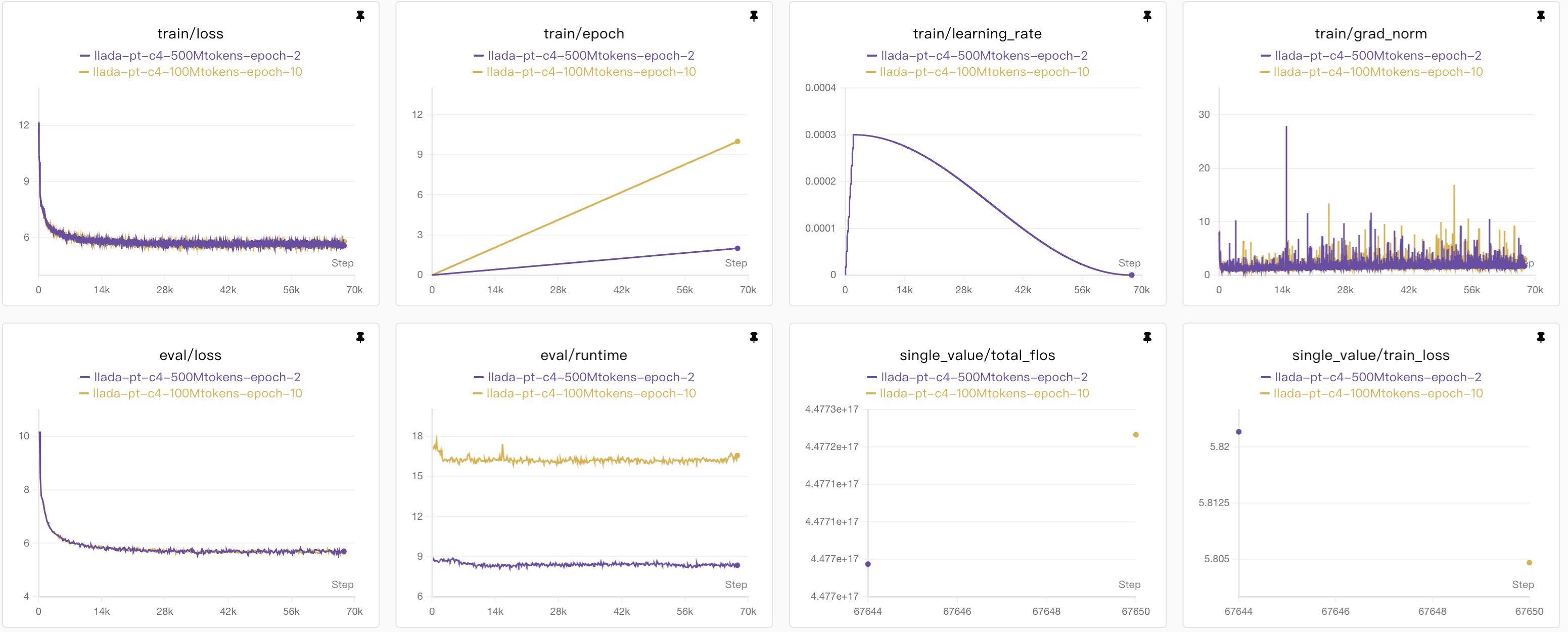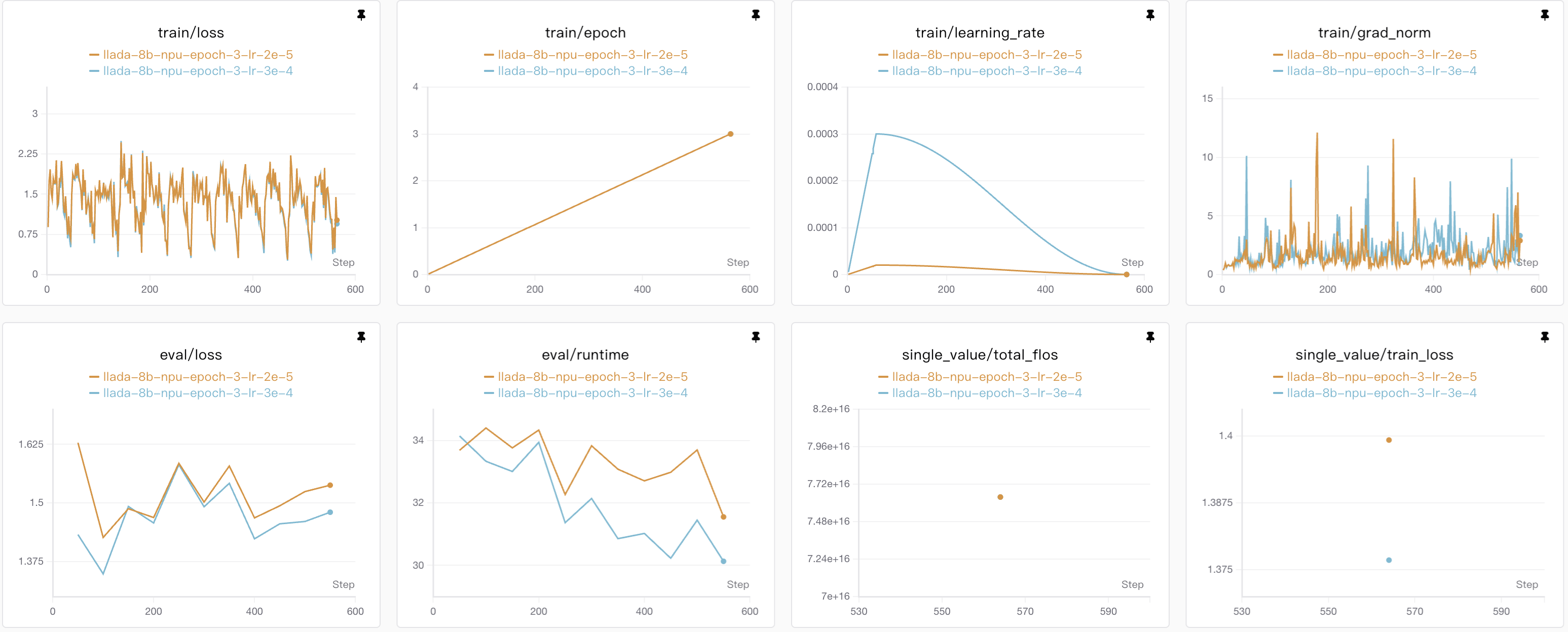 本教程基于昇腾910B3-64GB复现LLaDA模型的训练,代码使用dllm框架。框架中有完整的llada模型预训练以及微调方法,在此感谢作者开源的diffusion模型训练框架🙏。