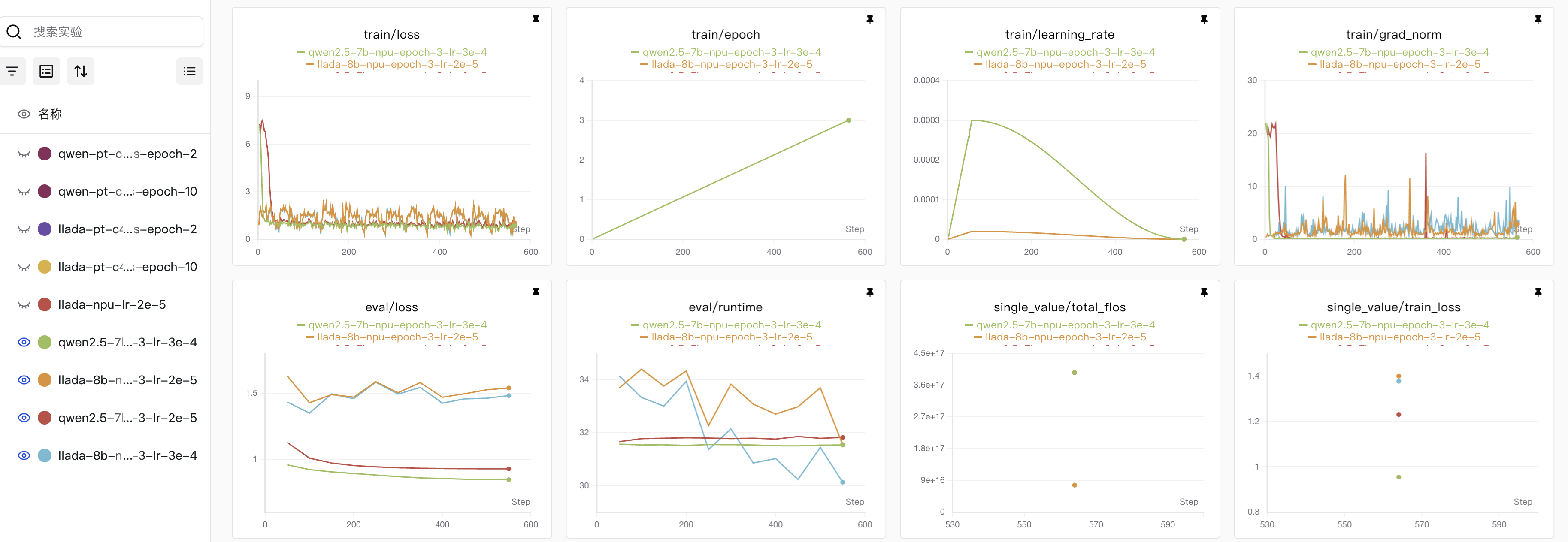在epoch=3的时候,Qwen模型表现出来的效果还是比较好的,但是如果更多的epoch可能会导致Qwen模型的过拟合,相比较而言llada模型还有下降的空间。