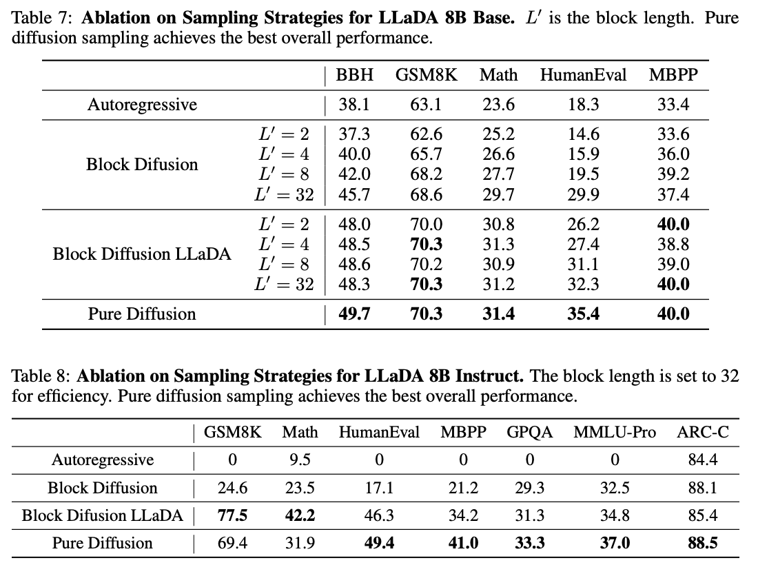 LLaDA模型使用纯扩散采样效果最好,如果使用块扩散采样,那么采用Block Diffusion LLaDA的方式最好。块内部的生成方式采用低置信度重掩码的方式生成。