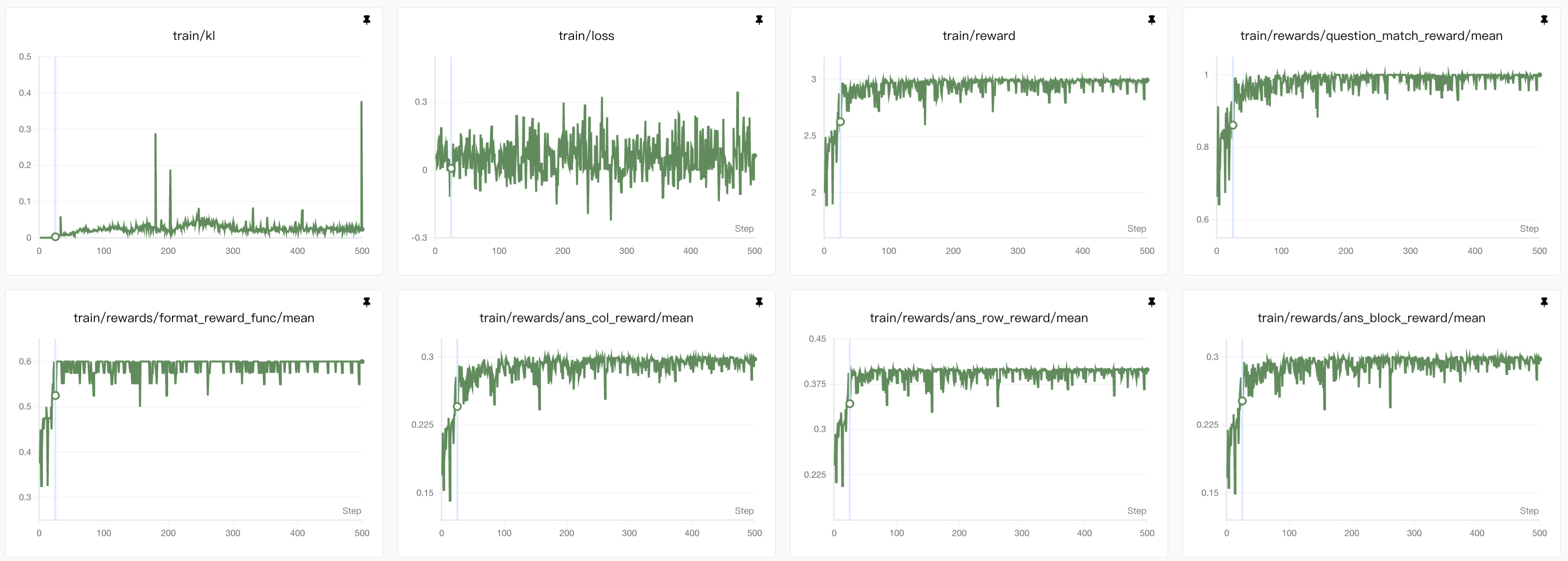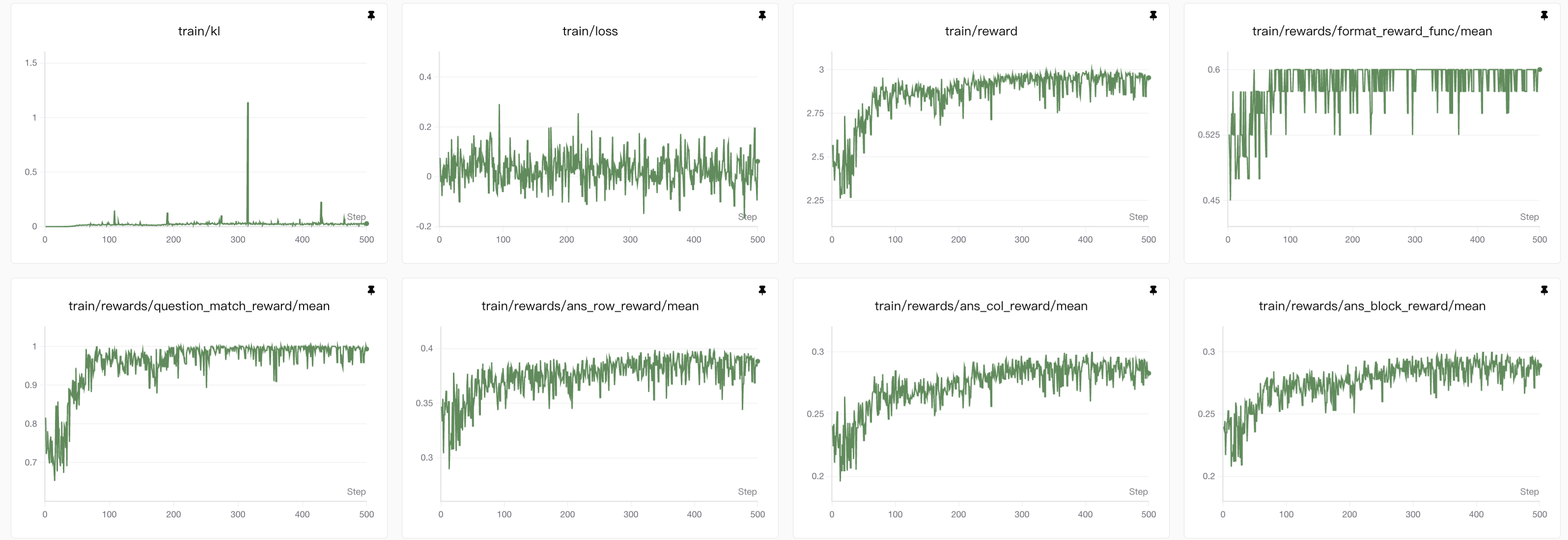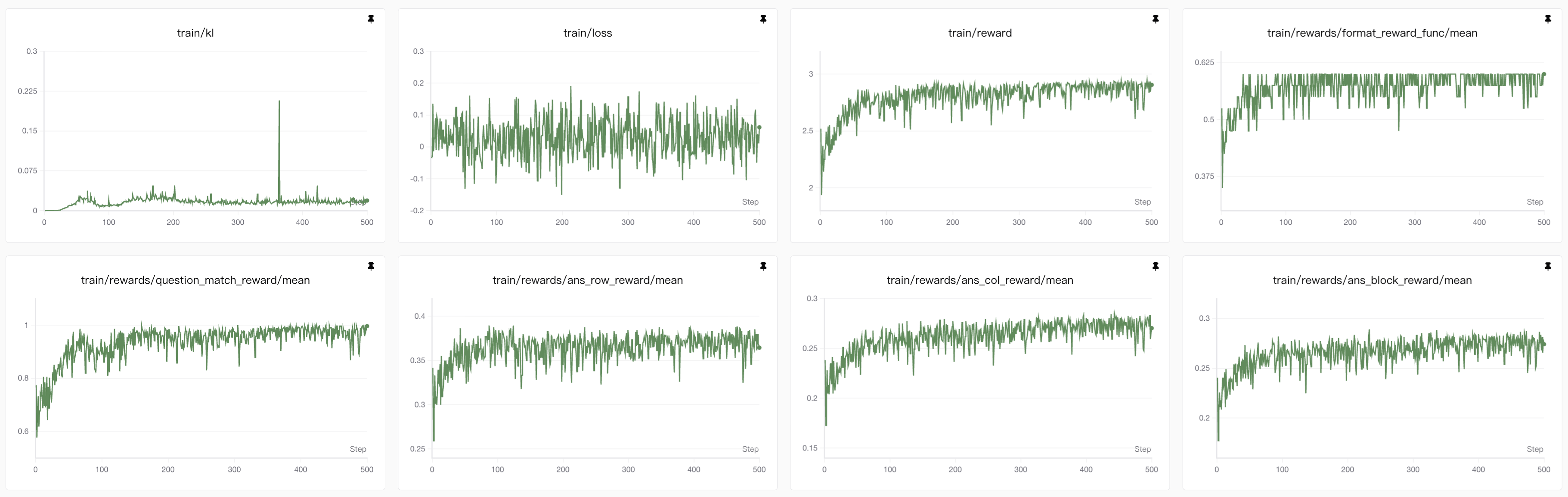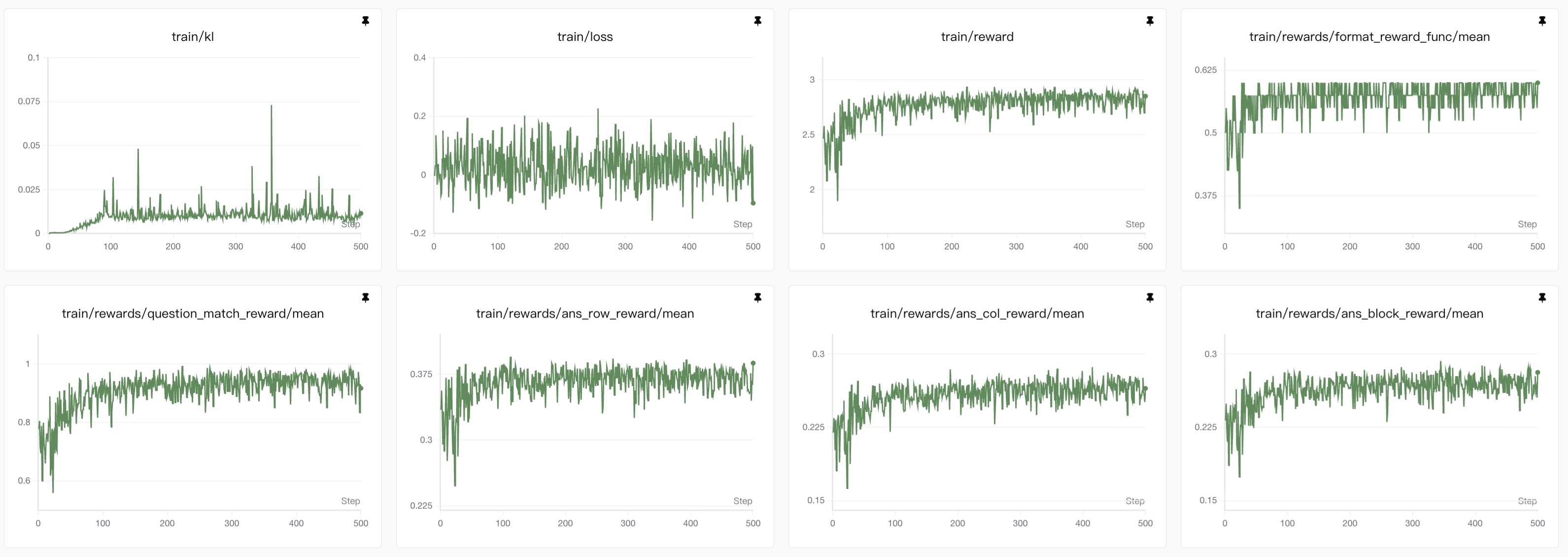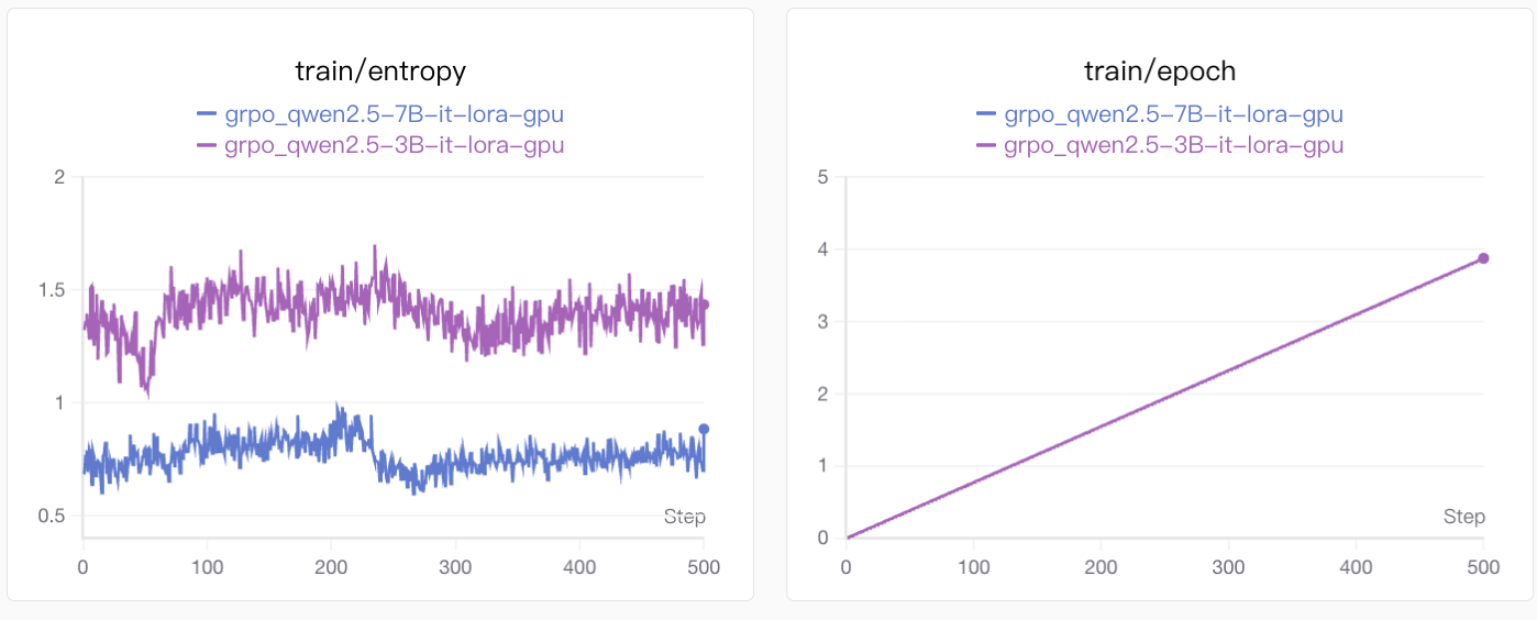 entropy表示的是训练过程中的熵(train/entropy),是衡量模型输出多样性的核心指标。熵(Entropy)在这里指的是模型预测 token 的概率分布的不确定性,因此值越高,答案的不确定性也就越高,由于我们的答案是结构化输出,而且由于数独挖空较少所以很难有多个解的情况,因此答案越确定越好。