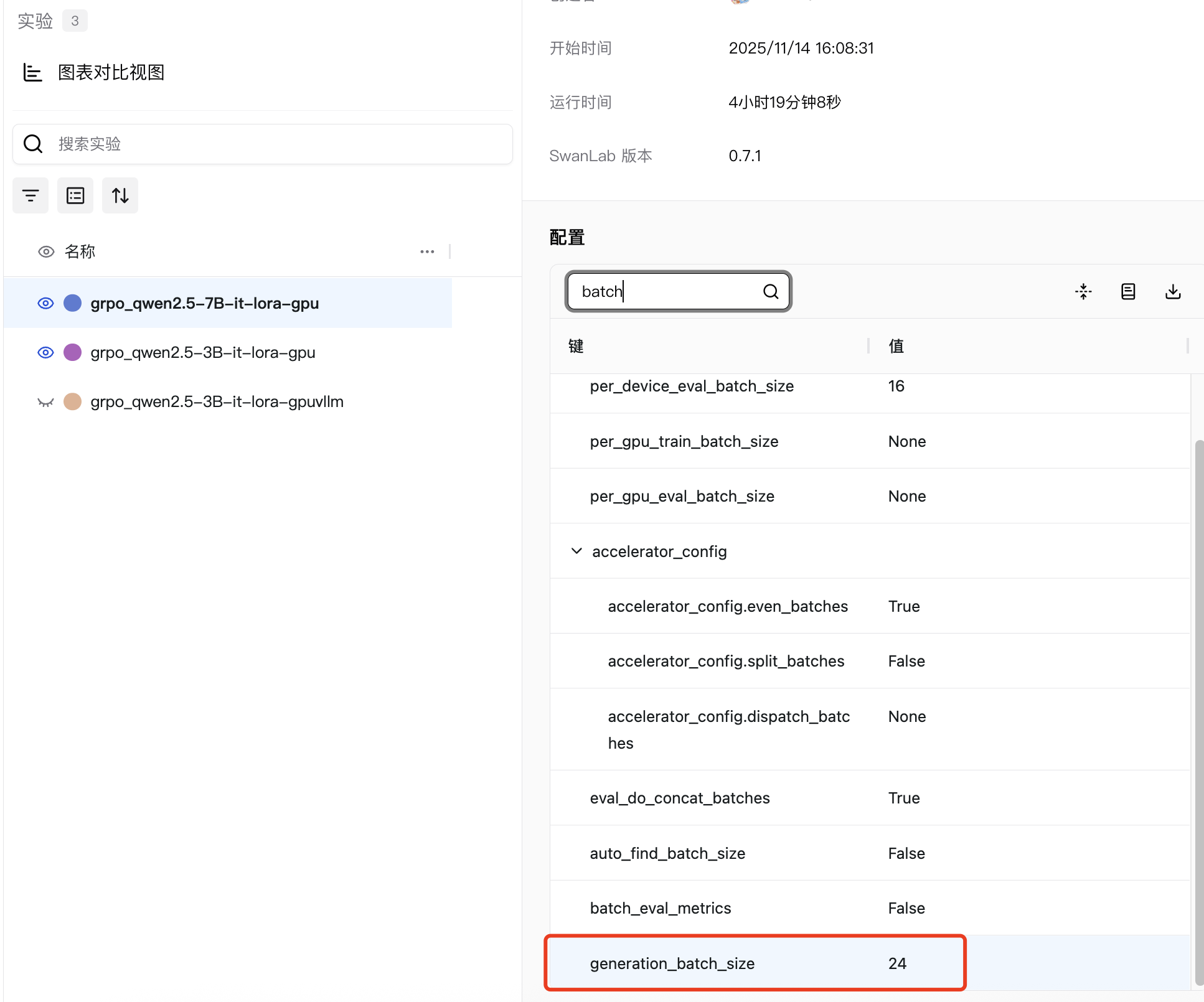 况且整体的batch也要控制, generation_batch_size=num_devices x per_device_train_batch_size x gradient_accumulation_steps,在SwanLab的卡片中也可以直接看到整体的batch,我们的实验统一是24。