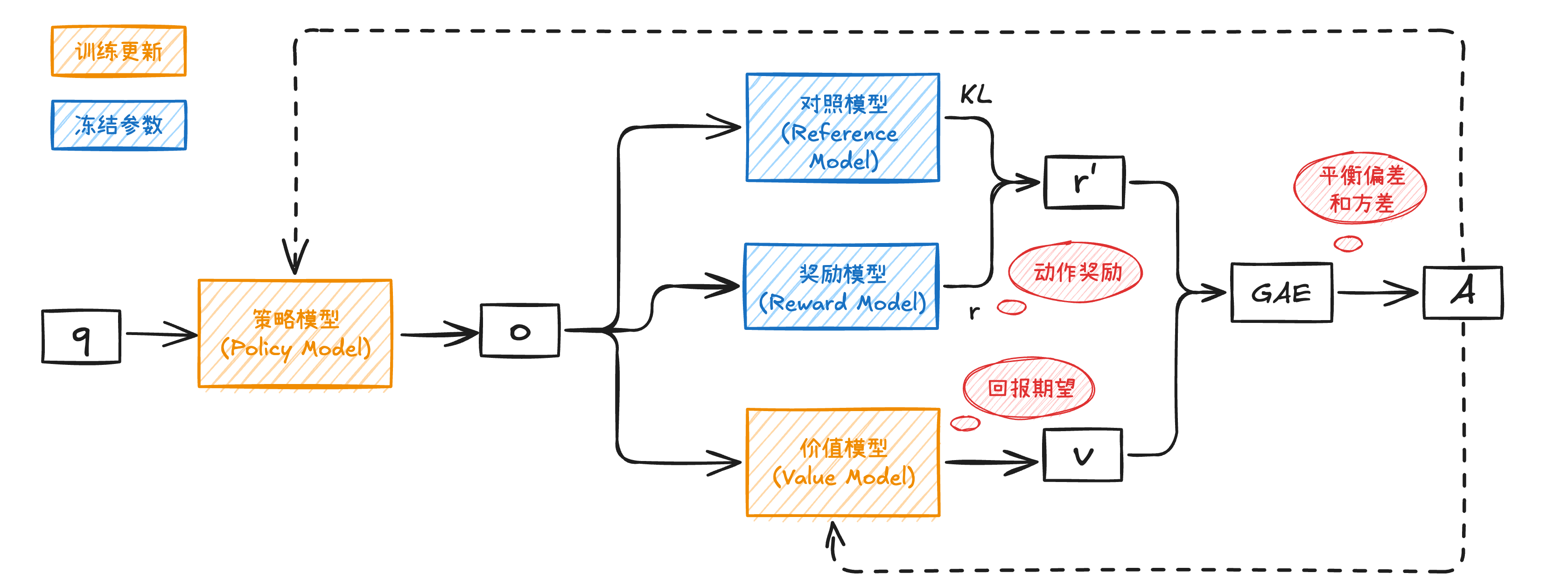 奖励模型(Reward Model)用于计算每个动作对应的奖励,训练时参数固定。价值模型(Value Model)用于计算某个状态选择某个动作后的回报期望,需要跟着策略模型一起训练,因为需要根据策略模型生成的回答去估计未来回报。