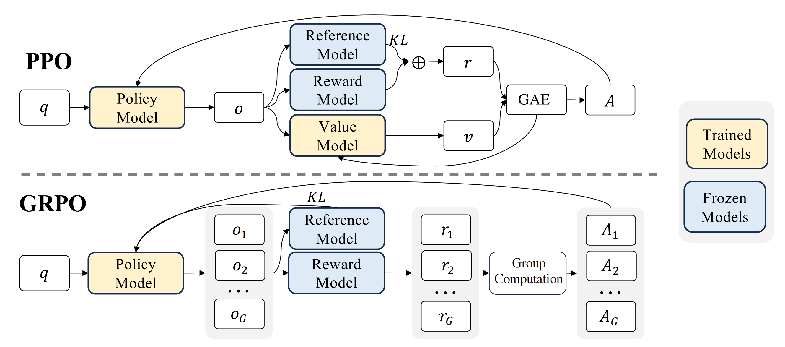 上面我们对PPO的原理有了比较清晰的认知,那么GRPO具体做了什么呢,我们直接上论文里的图: