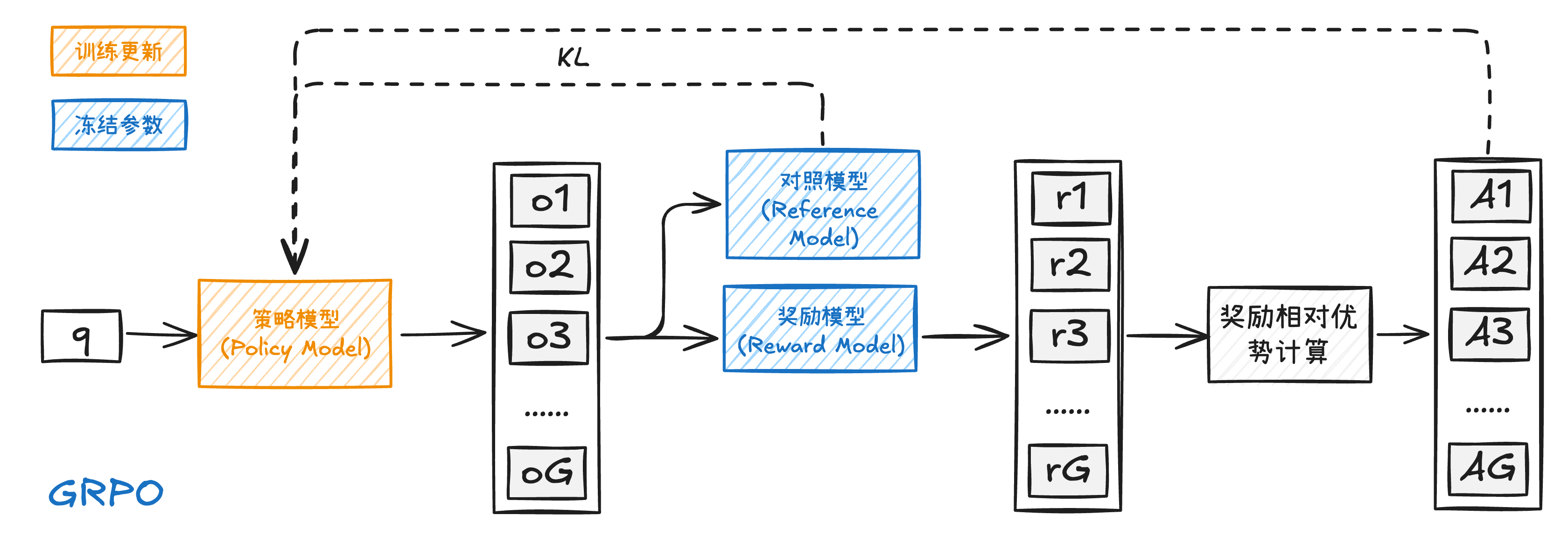 GRPO(Group Relative Policy Optimization,群体相对策略优化)优化了这些问题,GRPO在训练过程中,对于每一个问题q,旧的策略会生成G个输出