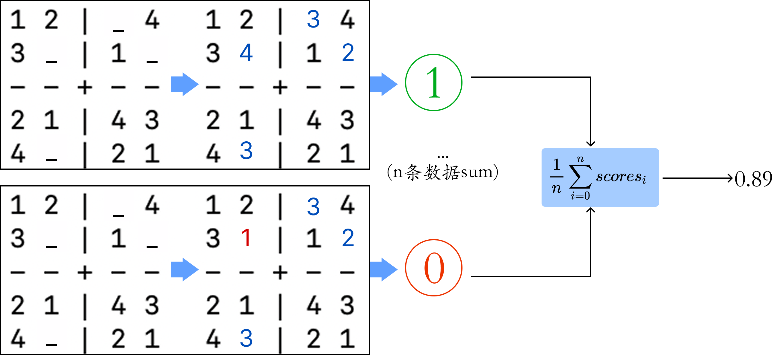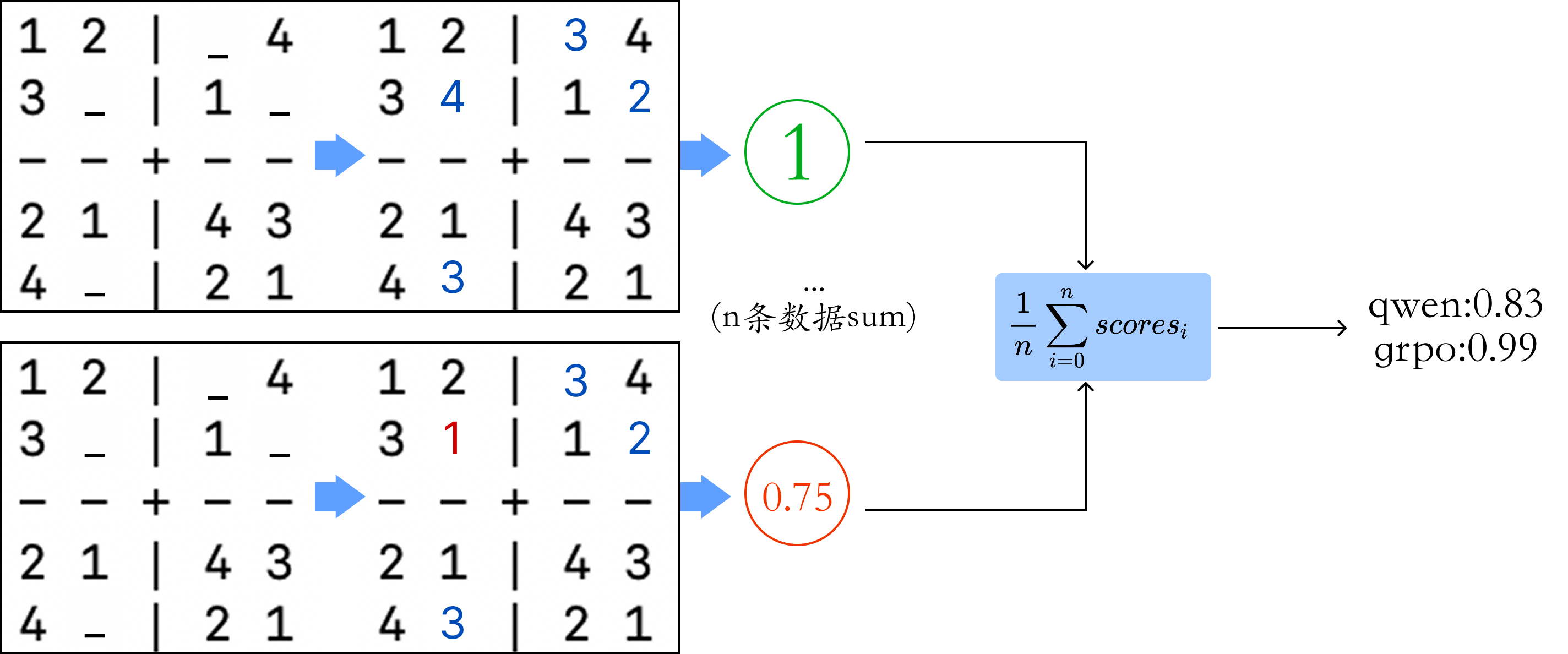 同一个问题可能回答的结果不一样,但可能符合数独游戏规则,因此我们不能以单纯的对错来设计解答的准确度奖励,而应该以规则的遵守程度来设计奖励函数,比如每行、每列、每个小格子是否都遵守了规则,如果没有遵守,错了多少个就扣多少分。