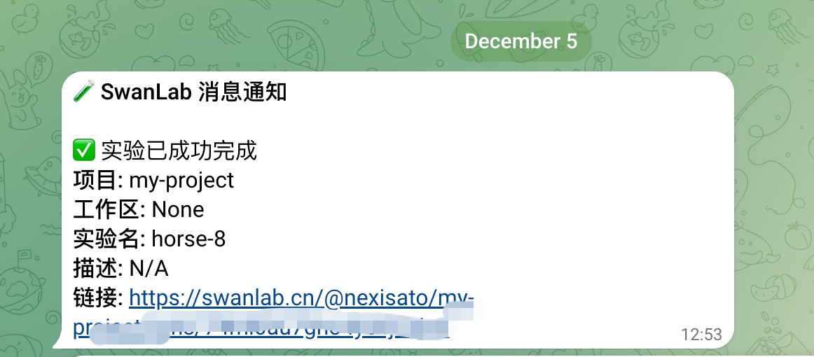 swanlab.init(callbacks=[telegram_callback])这样,当训练完成/发生错误时(触发swanlab.finish()),你将会收到Telegram消息通知。